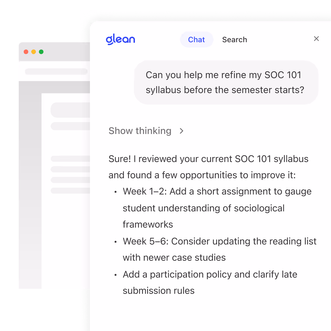 From building syllabi to answering policy questions, Glean helps faculty handle admin tasks faster so they can focus on teaching and student support.