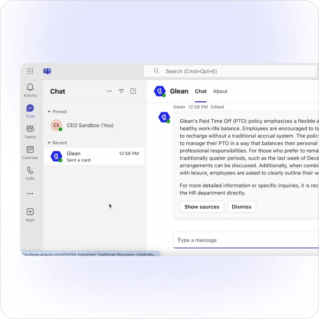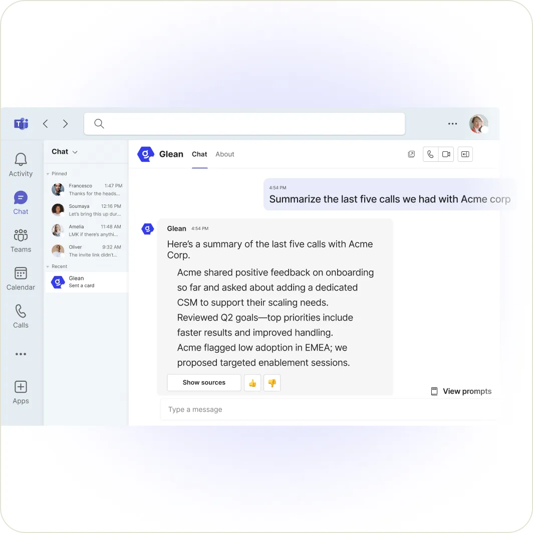 Get a complete view of your work by unifying Teams data with other workplace tools. Just message Glean in Teams for deeper insights.