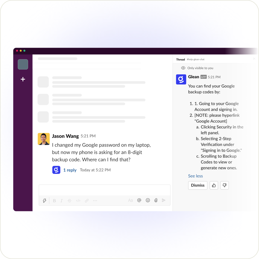 Chat directly with Glean in Slack to surface answers from past messages, documents, and company-wide knowledge.