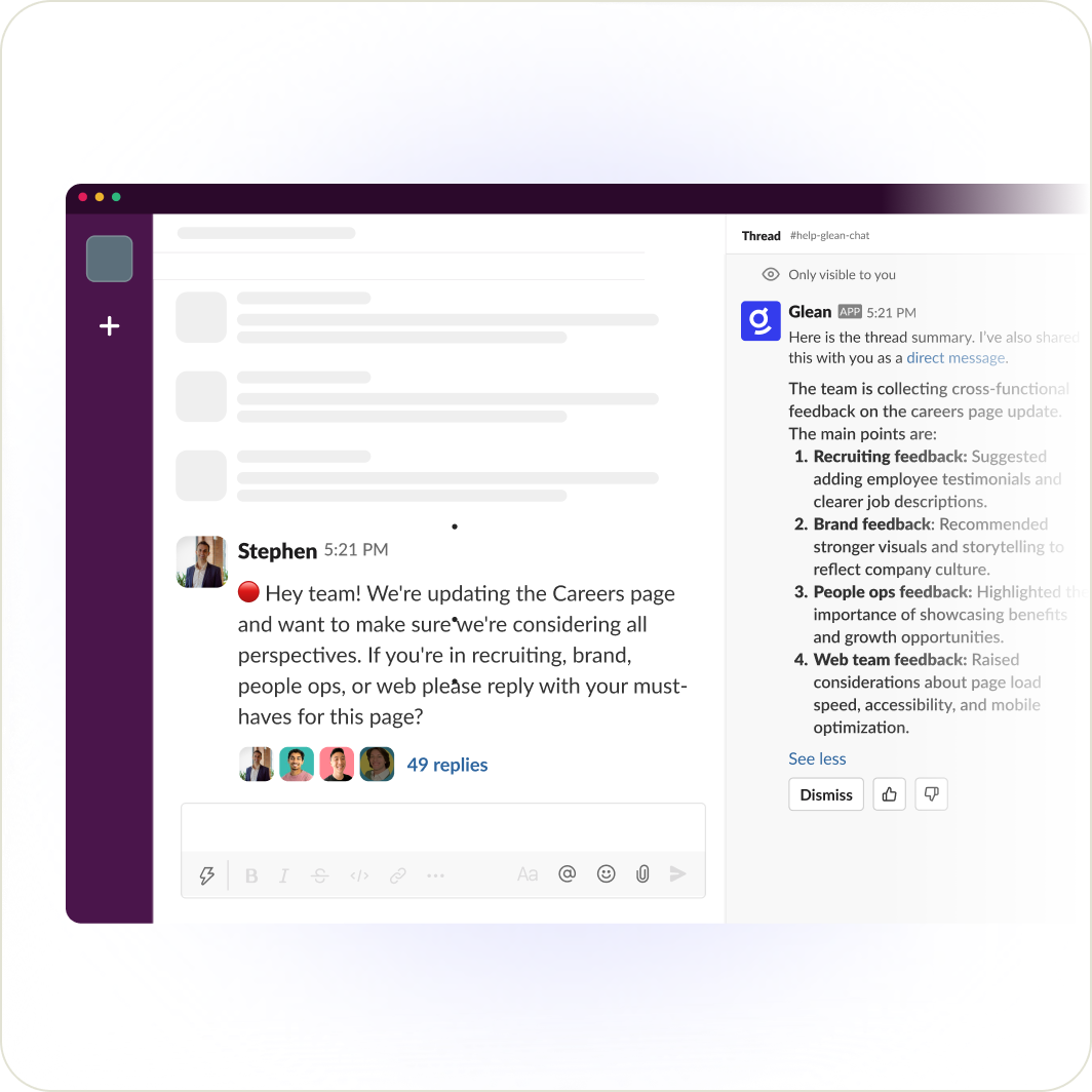 Slack moves fast, so key updates can get buried. Glean agents proactively summarize channels and threads, making sure you never miss important conversations.