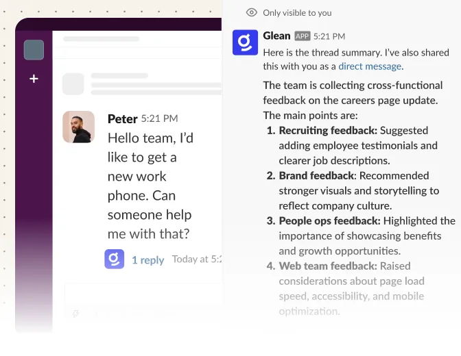 Glean finds what you need, recaps key conversations, and streamlines workflows directly in Slack — so you can work without interruptions.