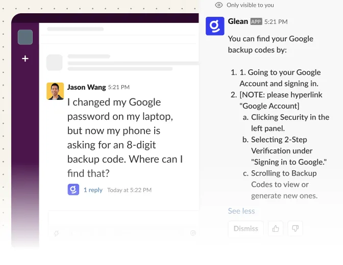 Glean combines Slack conversations with insights from your other enterprise tools to give you everything you need to make informed decisions.