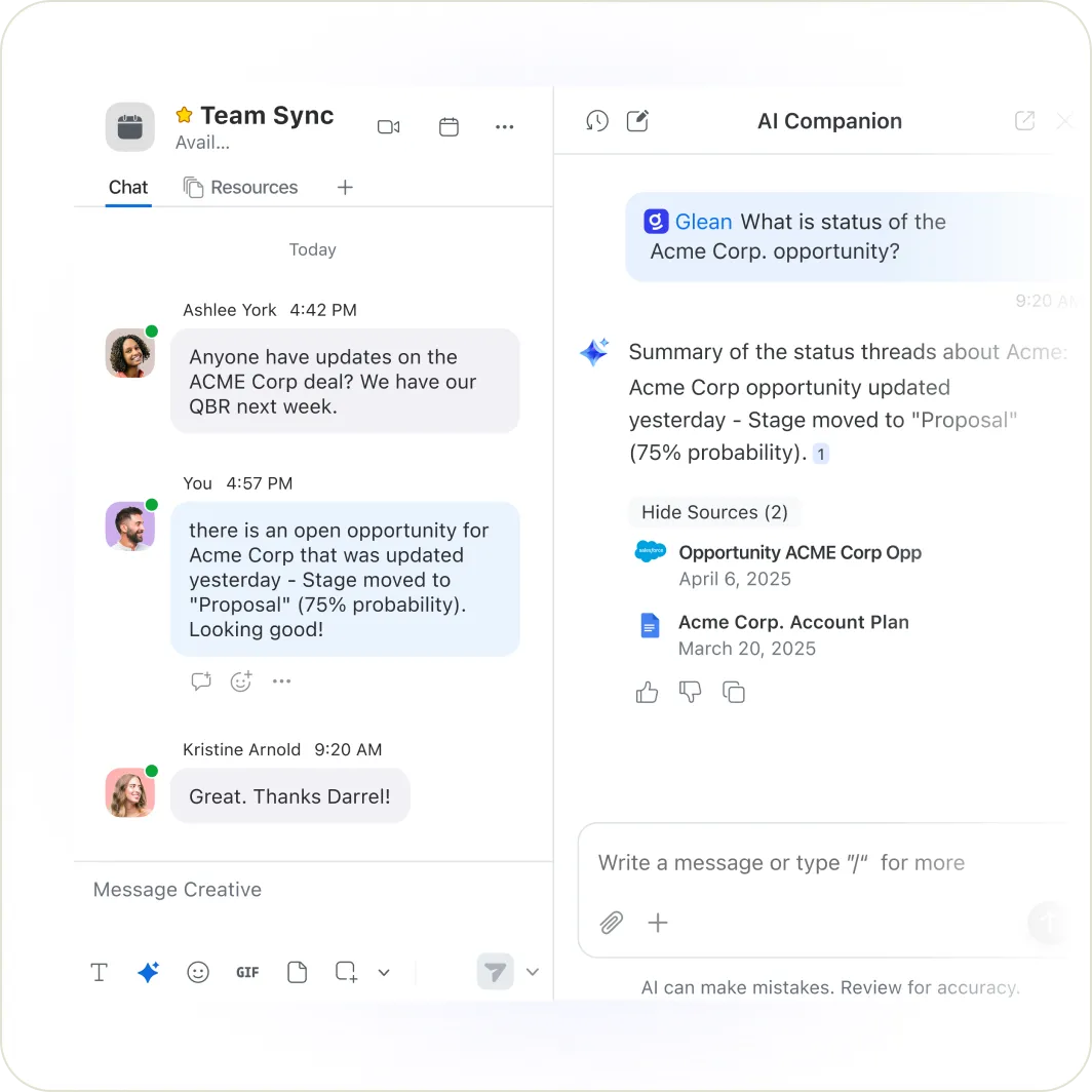 Stop switching apps in the middle of your workflow. Glean brings answers from your company’s data sources into Zoom AI Companion, so you can stay focused.