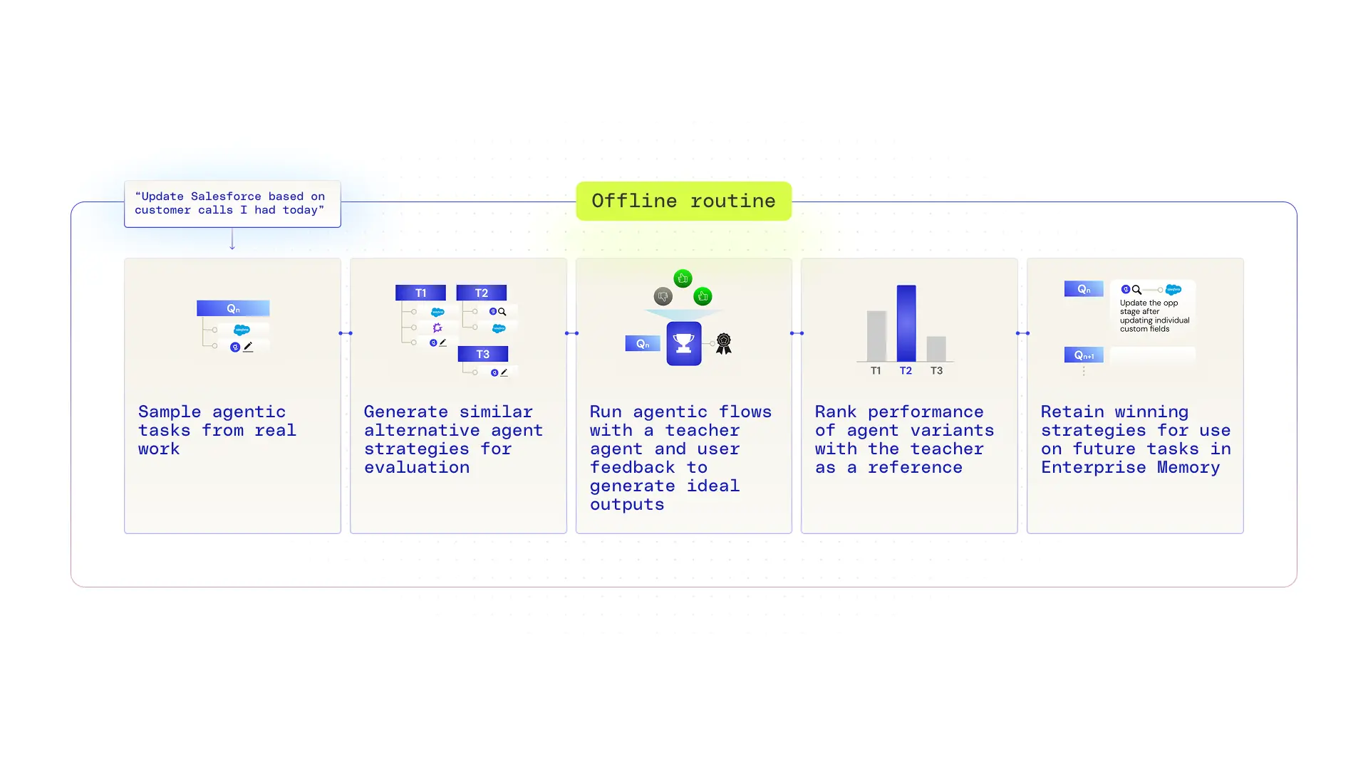 With enterprise memory in Glean, we store traces of agent runs, including which tools were used, the parameters passed, the sequences attempted, and the outcomes. Offline, on a per-enterprise basis, we then run permutations with different tool choices and arguments. We grade the results on correctness, completeness, and efficiency, and feed the learnings back into the system in natural language—the language of LLMs. These learnings provide guidance on which tools to use and why, how to structure tool inputs, and how to sequence actions. The focus is entirely on tool-use heuristics—not on the enterprise data itself for data security protection.