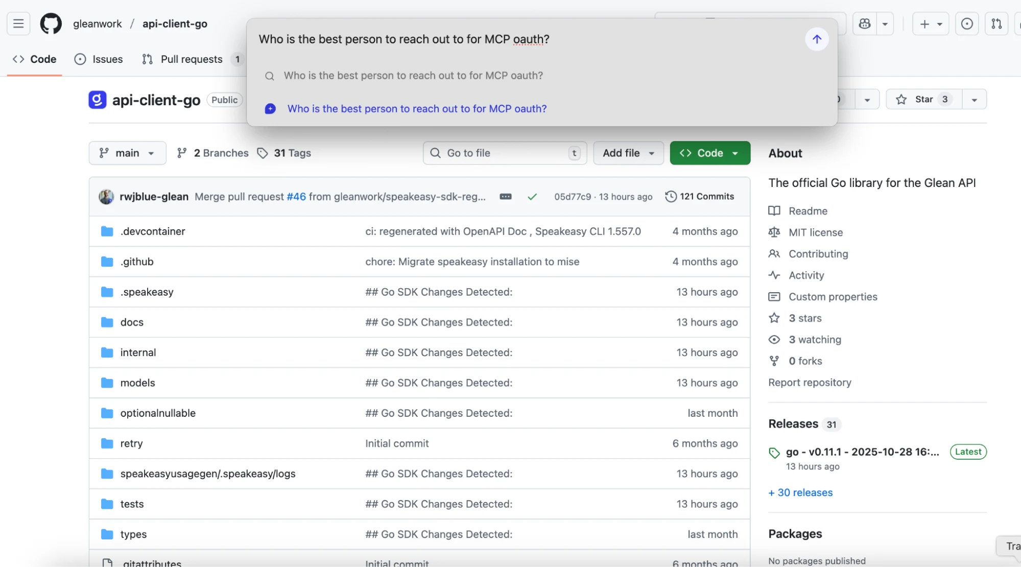 - Have Glean assist in code reviews by explaining unfamiliar functions, finding related PRs, or surfacing style guide rules without losing your place in the diff.