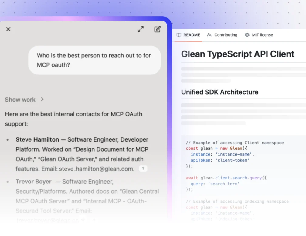 At Glean, we believe that AI should move at the speed of work, right alongside you. That’s why we’ve embedded Glean into the applications our users work in and love most—like Miro, Slack, Github, Teams, and more. We’ve also built key surfaces like the Glean mobile app, companion, and browser extension sidebar, making it easy for employees to leverage Glean wherever they work. Regardless of each user’s work habits or their organization’s tools and processes, Glean strives to build flexible systems that adapt best to their workflows—not vice versa.