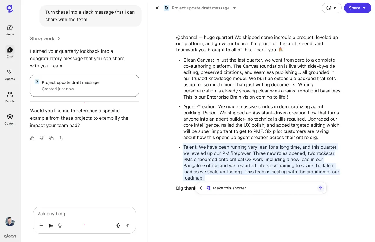 The Assistant is also personalized to follow your specific writing style. For enterprise work, tone and structure matter as much as content. Rather than a one‑size‑fits‑all “temperature” knob with users manually specifying their preferences, Glean tailors responses to your exact context because it understands where and what you write. You can experience this more clearly than ever through Glean Canvas, a newly dedicated writing surface for drafting polished, personalized, and professional content step-by-step alongside AI. Canvas makes it easy for everyone—engineers, sales executives, support staff, and others—to interactively edit text inline and collaborate conversationally.