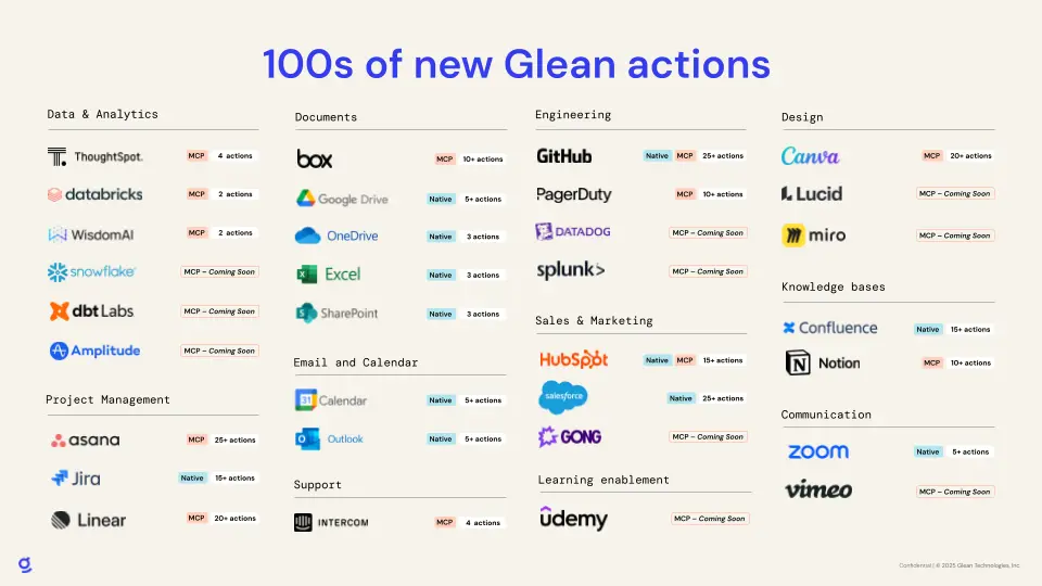 Beyond Glean native actions, we’re expanding the action space further with the Model Context Protocol (MCP) and a new directory, where you can enable more than 20 pre‑loaded servers to add entire families of actions. We’re thrilled to welcome in the initial directory cohort: Asana, Canva, Notion, Box, GitHub, Thoughtspot, Hubspot, Databricks, WisdomAI, and PagerDuty, and many more coming soon. These servers are enterprise‑grade—centrally managed, secured with OAuth, and vetted for safe use at scale.