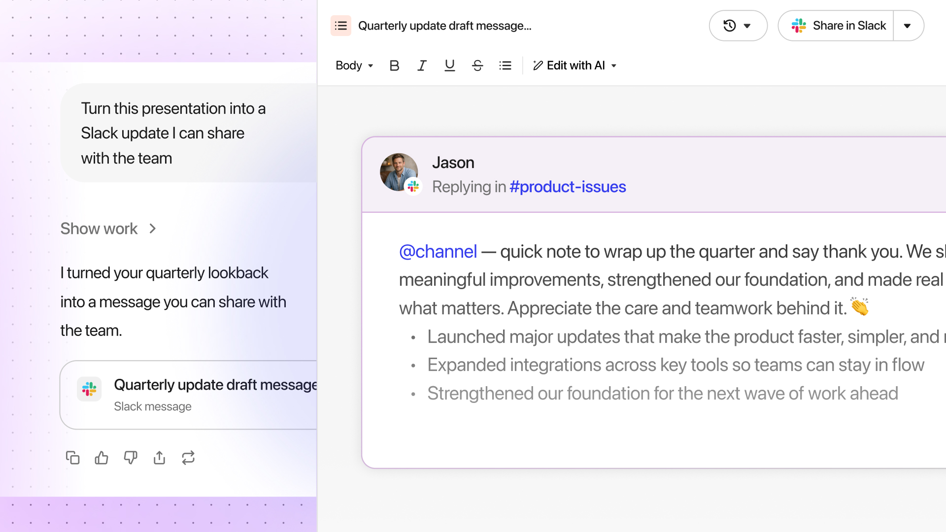 Last year, we launched canvas, a brand new interface where users can work with Assistant to develop written content. This update brings new canvas capabilities, including Slack and email adaptive UIs that can render drafts directly in the context of where you work.