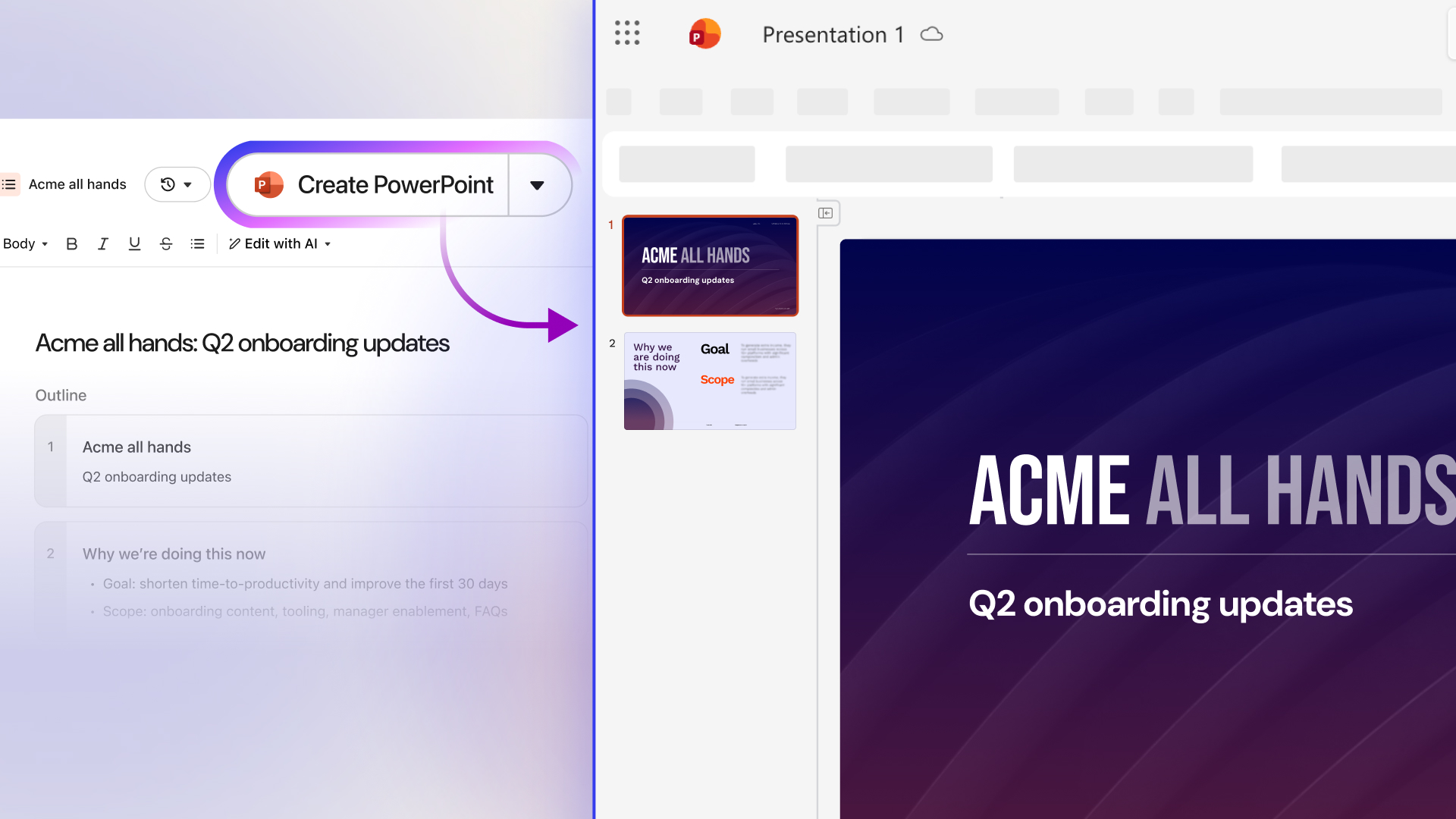 Assistant can now also take on work like drafting documents, images, and slide decks, as well as generating code. It instantly applies your company's slide template, fonts, and colors to create presentations that align with your brand from the very first draft. Because all content is grounded in your company’s knowledge, teams never have to start from a blank page and can move from idea to polished output faster.