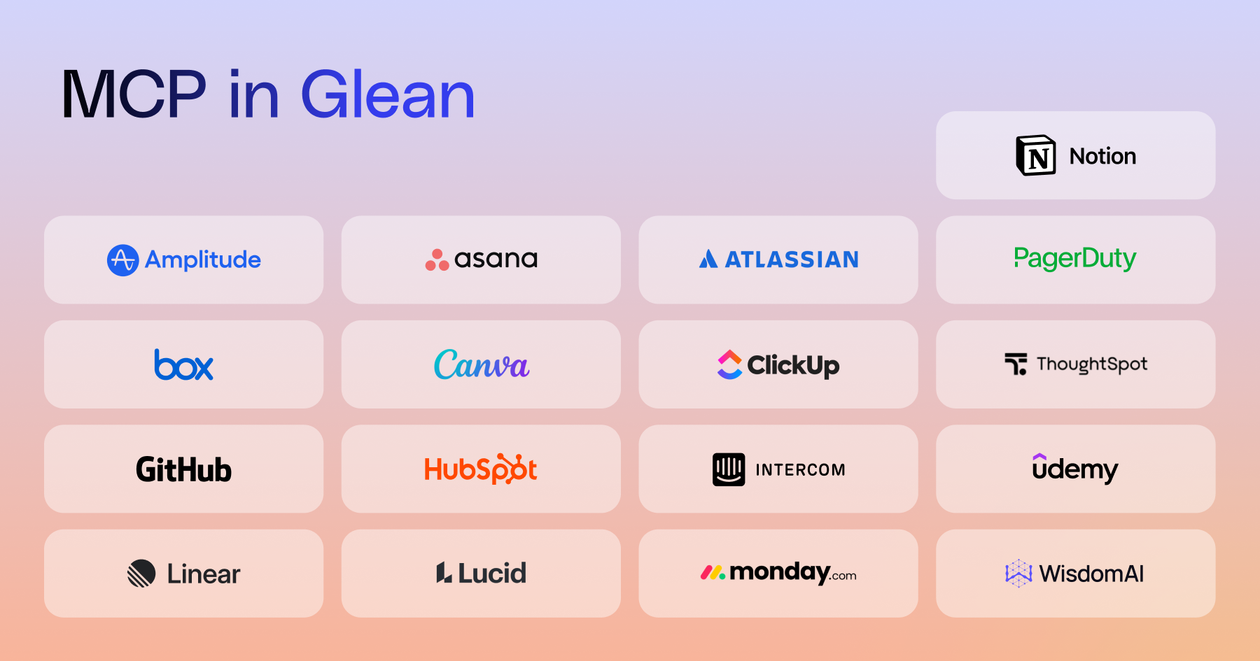 At Glean, we adopted MCP early, and already operate a remote MCP server that exposes Glean’s enterprise context inside AI chats and IDEs. Now, we’re bringing the broader MCP tools ecosystem into Glean Assistant and Agents, expanding the available action space. Glean makes it easy to get started with MCP through its directory, which features 17 preloaded servers from Amplitude, Asana, Atlassian Rovo, Box, Canva, ClickUp, GitHub, HubSpot, Intercom, Linear, Lucid, Monday, Notion, PagerDuty, ThoughtSpot, Udemy, and WisdomAI, while also supporting any compatible remote MCP server.