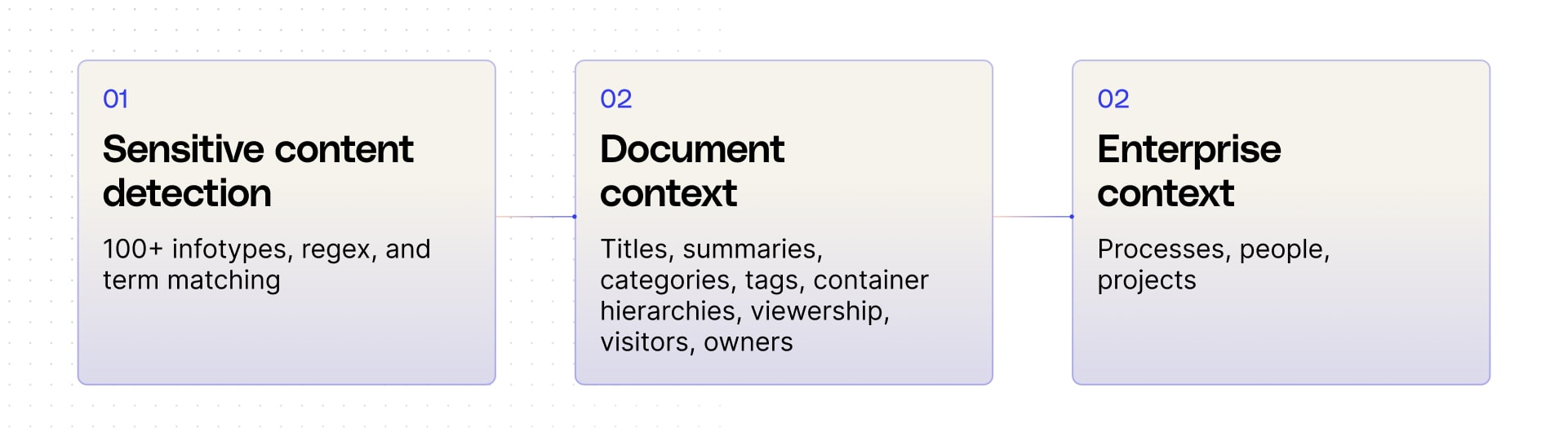 Glean goes beyond looking at the document in isolation. It also looks at documents that are closely linked as well as where the document resides in folder structures, channels, and more. Documents owned by security teams, located in training containers, or tagged with educational metadata, receive different risk assessments than those in operational systems.