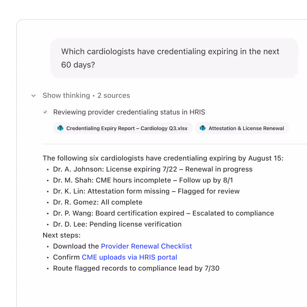 From clinical staff to claims teams, Glean makes it easy to find SOPs, workflows, and answers to questions. That means faster onboarding, fewer mistakes, and a smoother ramp-up for new hires.
