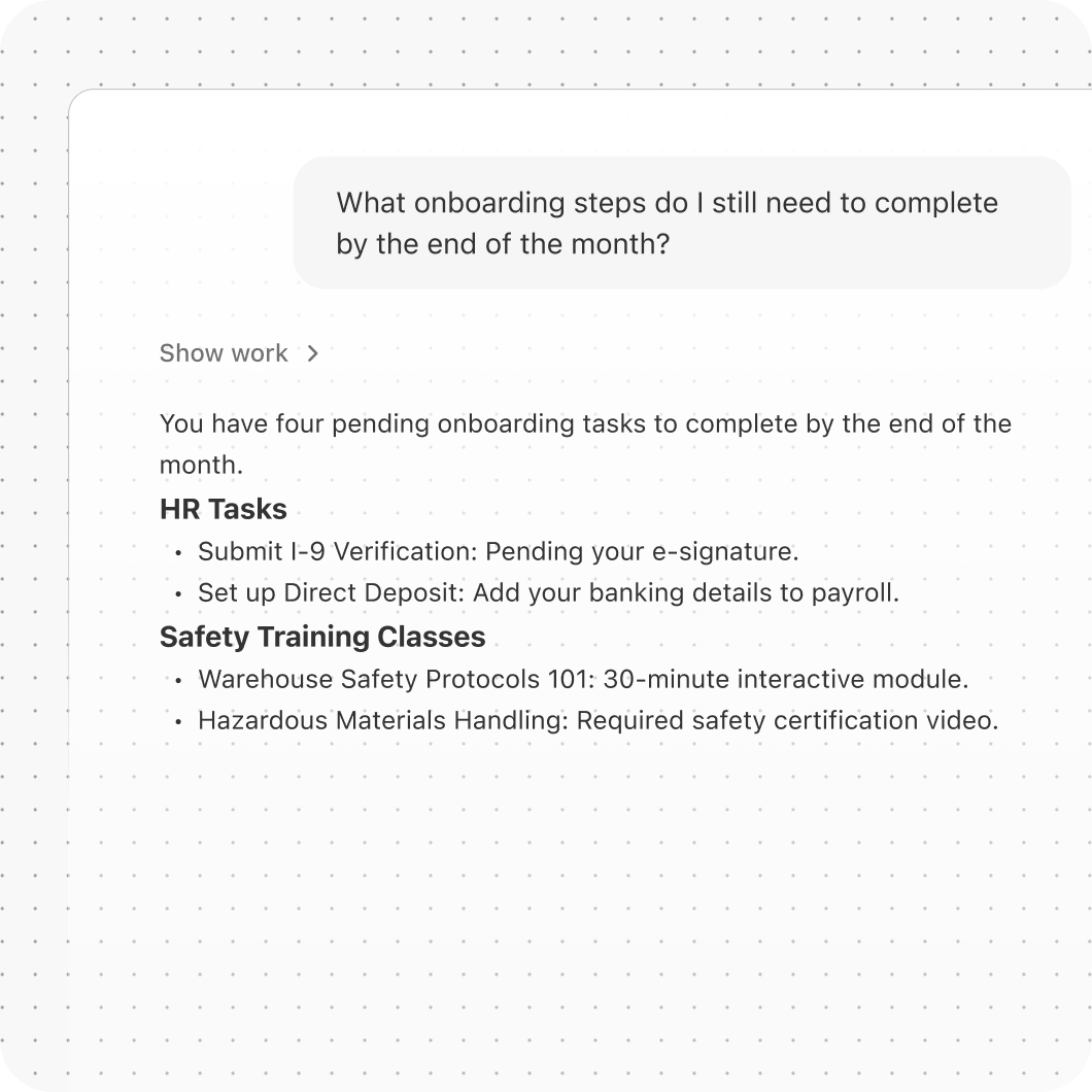 Centralize training materials, work instructions, and plant-specific information so new operators can self-serve answers and onboard quicker.