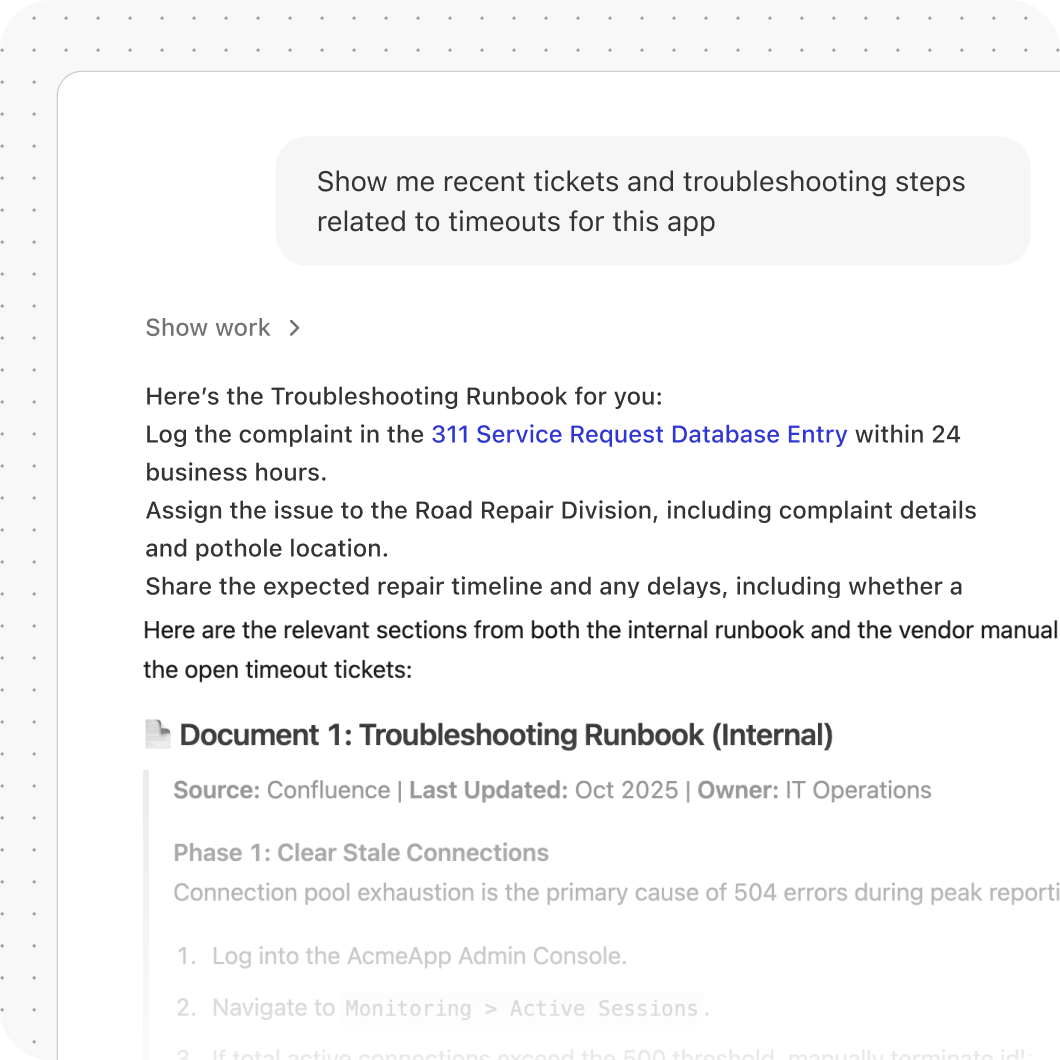 Give IT and OT teams a single place to search tickets, runbooks, system docs, and vendor manuals so they can diagnose and resolve production issues faster.