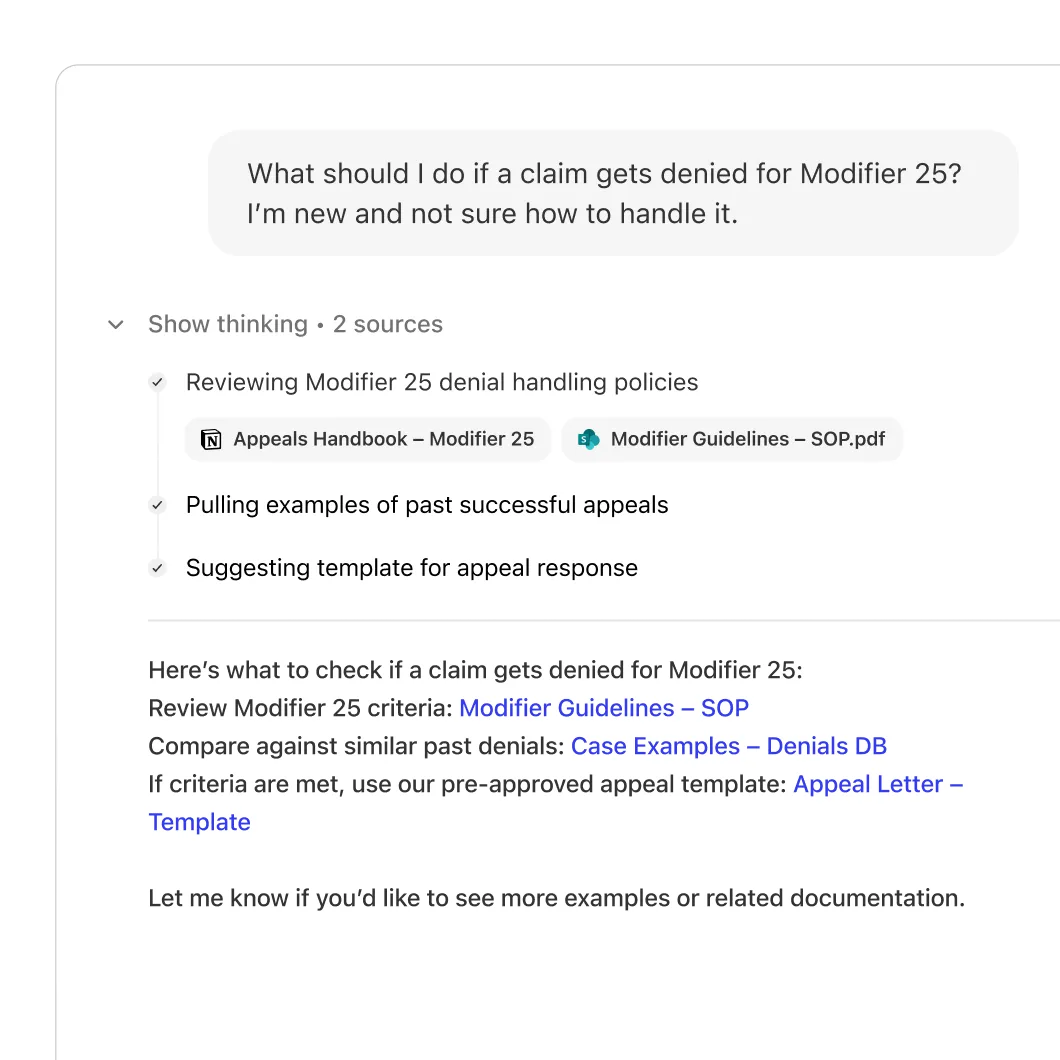 収益チームが支払者ポリシー、過去の承認、コンプライアンスガイドラインにすぐにアクセスできるようにします。適切なコンテキストをすぐに利用できるため、よりクリーンなクレームの提出、拒否に対する異議申し立て、監査への対応に自信を持って対応できます。