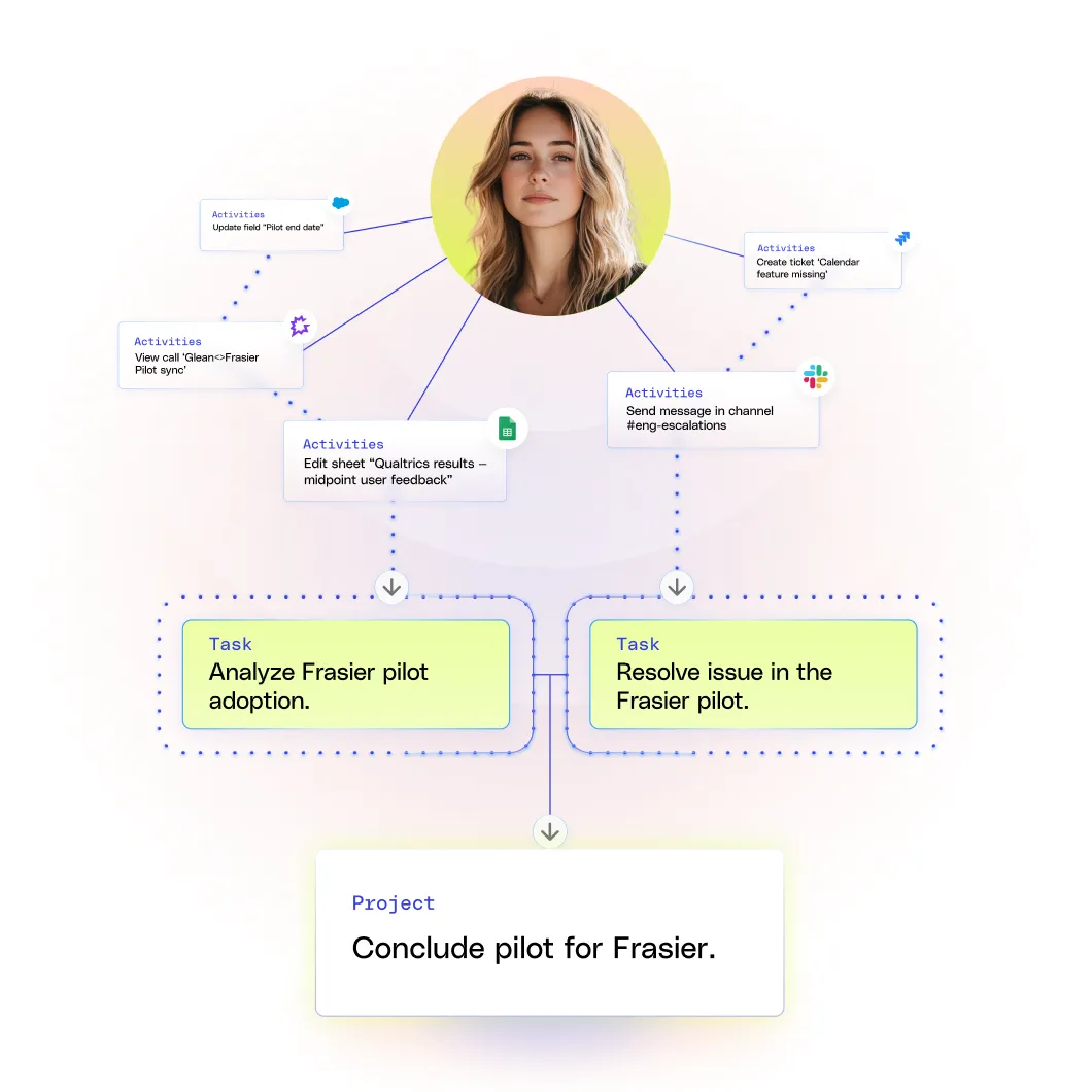 Gleanはあなたの働き方を記憶し、そのスタイルに合わせて支援します。パーソナルグラフがあなたの目標や責任、会社の優先事項を理解し、本当に重要なことを最適なタイミングで提示します。