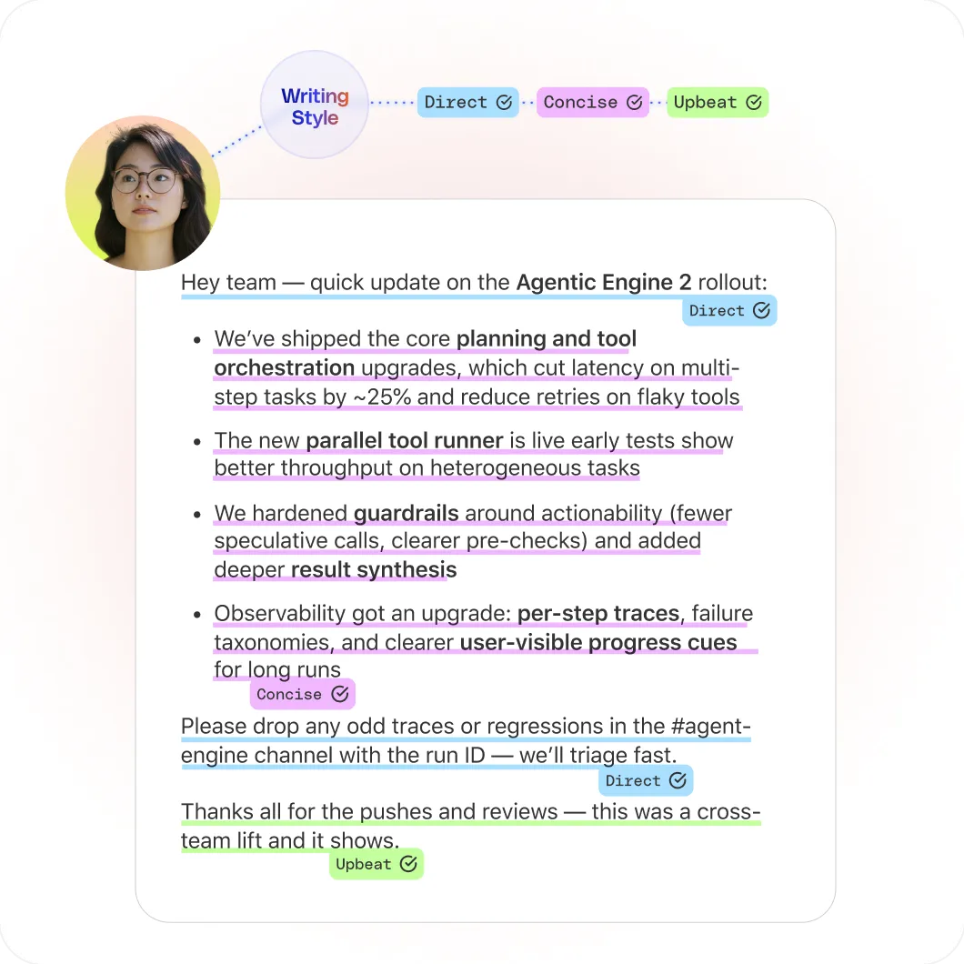 AIを使ってもあなたの文体や個性はそのままに。技術文書、会議資料、カジュアルなチャットまで、あらゆる場面であなたの声を再現します。