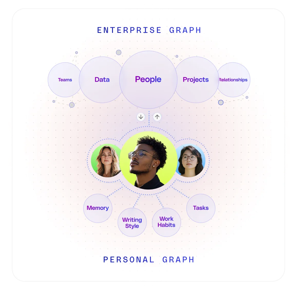 パーソナルグラフとEnterprise Graphが連携し、戦略的視点と実務レベルの知見を兼ね備えたAIを実現します。抽象度の高い戦略立案から具体的な実行支援まで、十分なコンテキストをもとに高度な業務を遂行します。