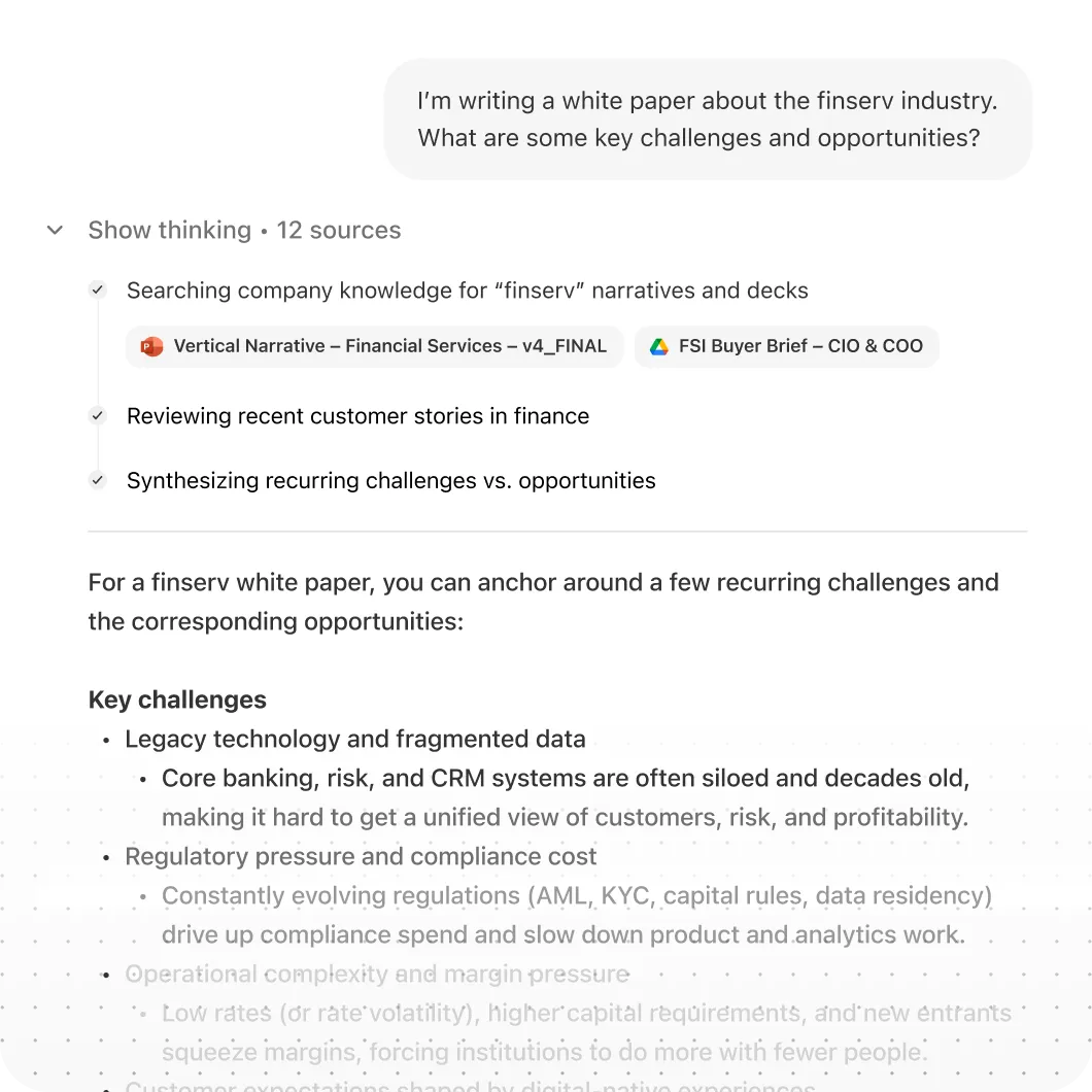 重点アカウント向けに最適化されたブリーフメッセージ、経営層向けメールを迅速に作成。CRMメモや過去の成功事例、業界視点を活用し、チームを即座に支援。