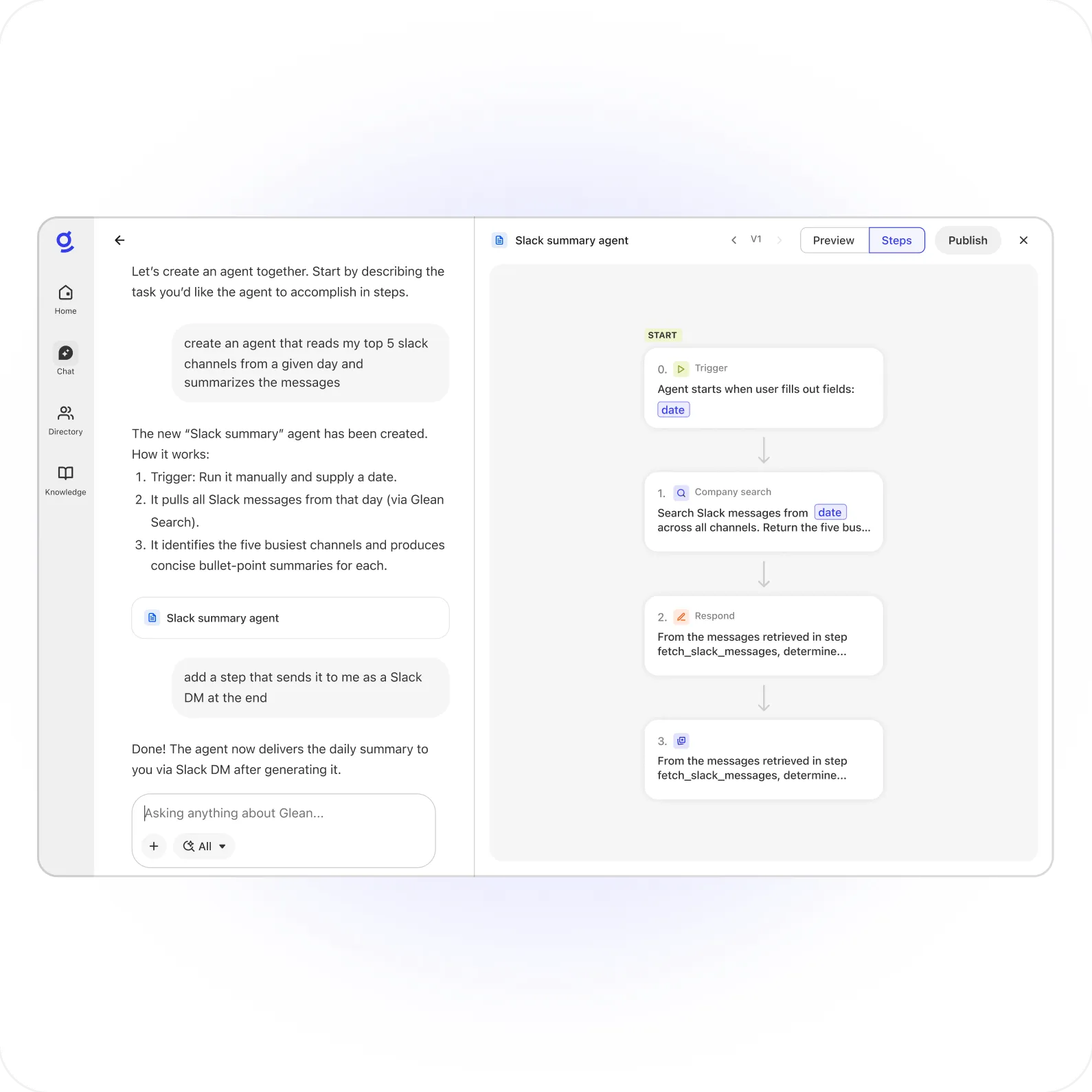 Turn ideas into structured workflows using simple, natural language prompts alongside our visual builder. Glean interprets your goals and makes it easy to build, edit, and scale agents — no code required.
