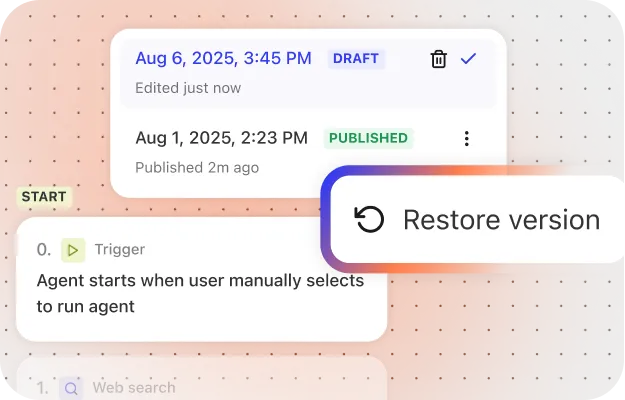 Every change is versioned automatically, making it easy to test, roll back, and refine agents without losing progress or interrupting live workflows.