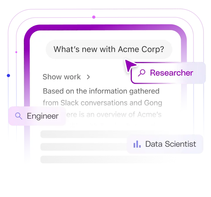Ask anything and get answers grounded in your internal documents, conversations, and the public web. Glean cites every source, so you always know what to trust and where it came from.