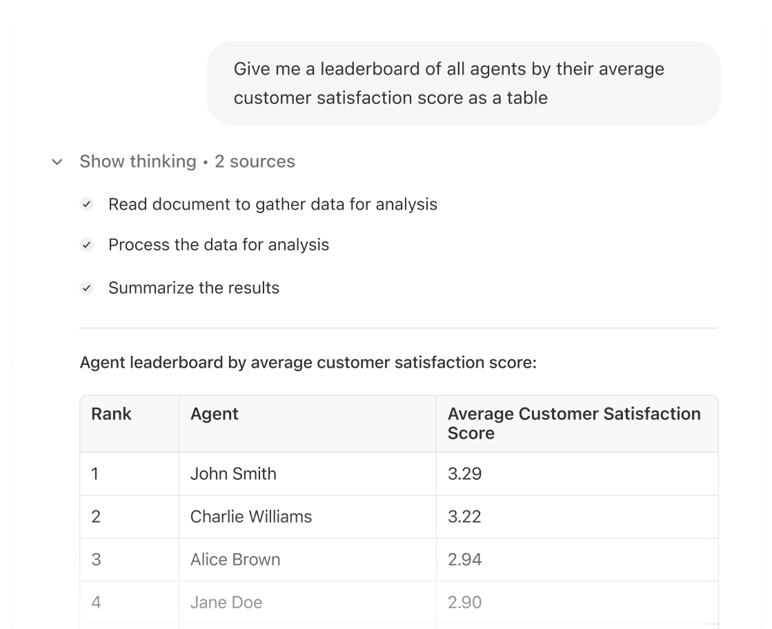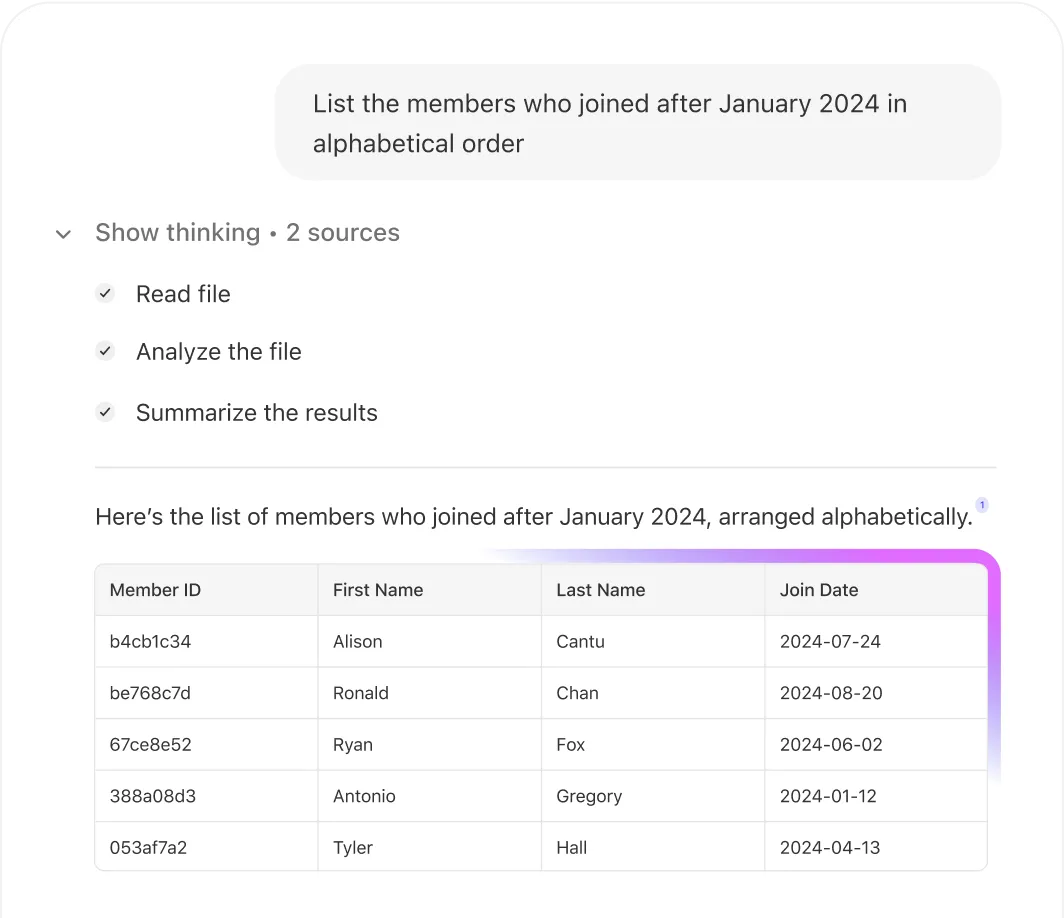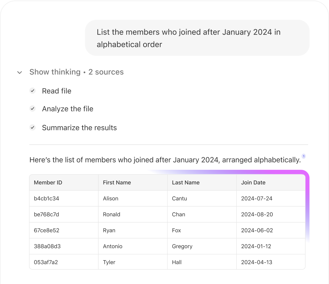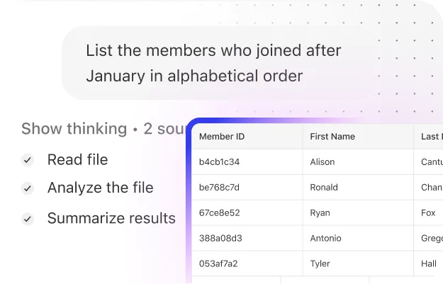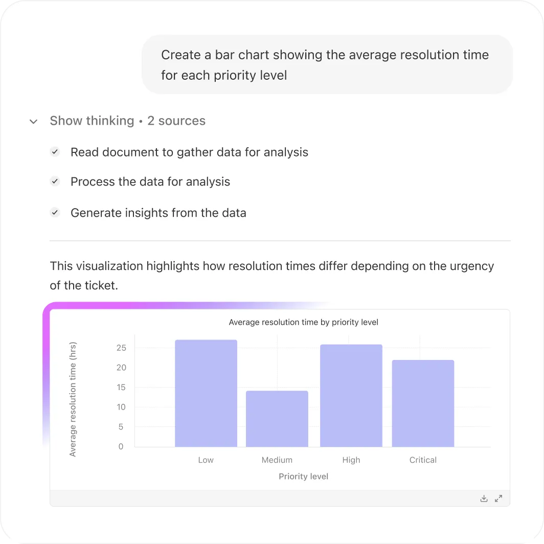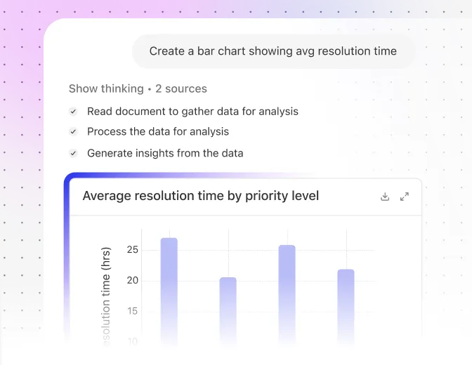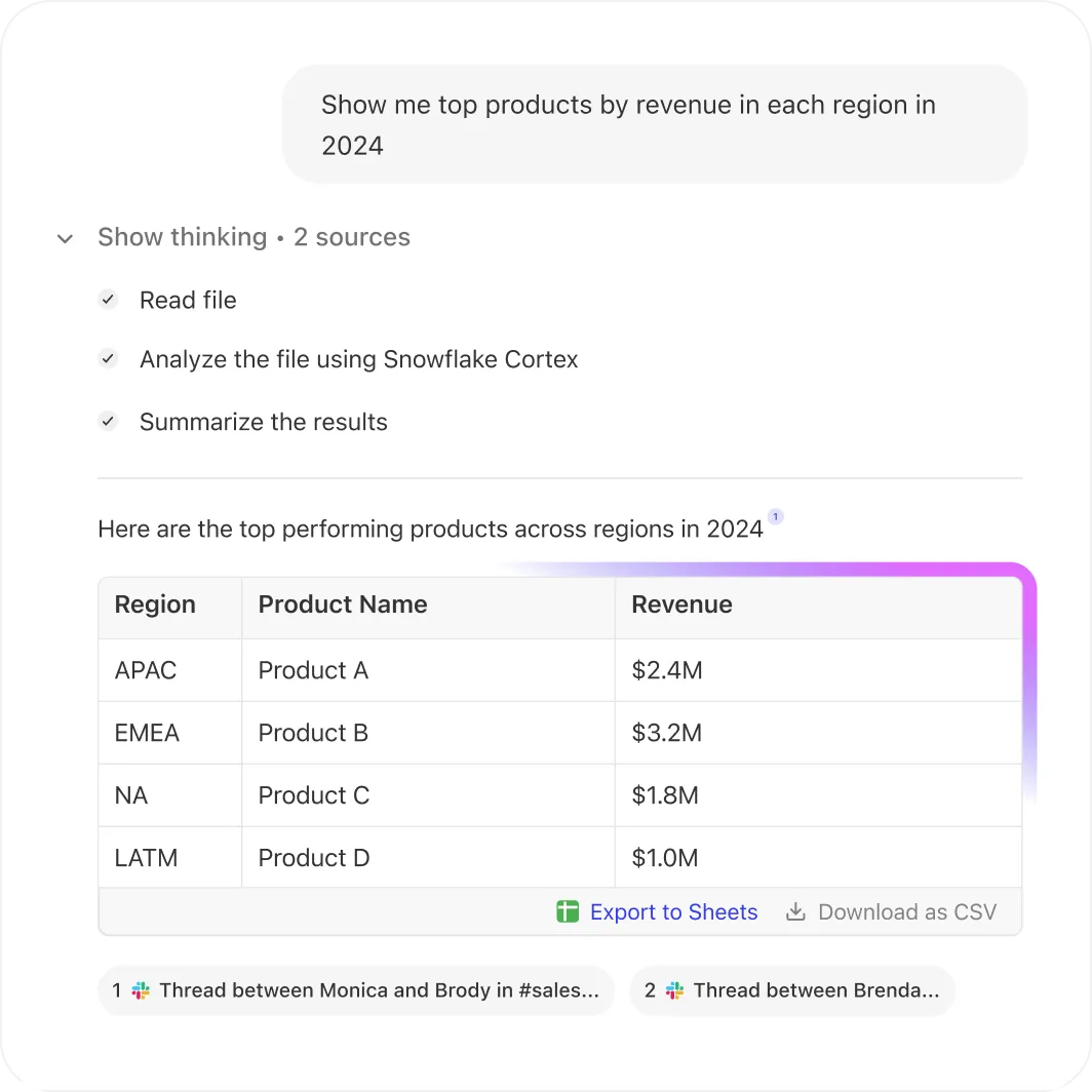 From spreadsheets to slide decks, Glean Assistant helps you surface insights fast. Just ask in natural language — it summarizes key points, identifies trends, and keeps your team aligned.
