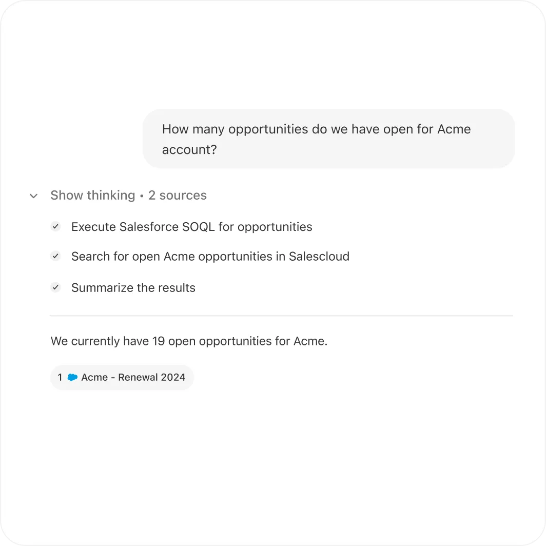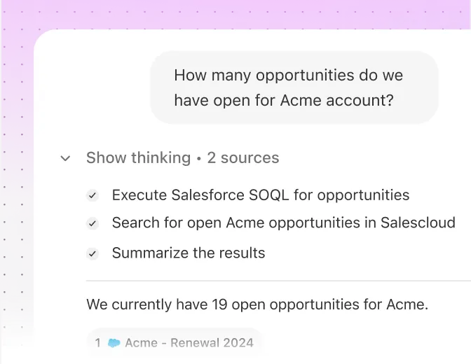Ask anything and get answers grounded in your internal documents, conversations, and the public web. Glean cites every source, so you always know what to trust and where it came from.