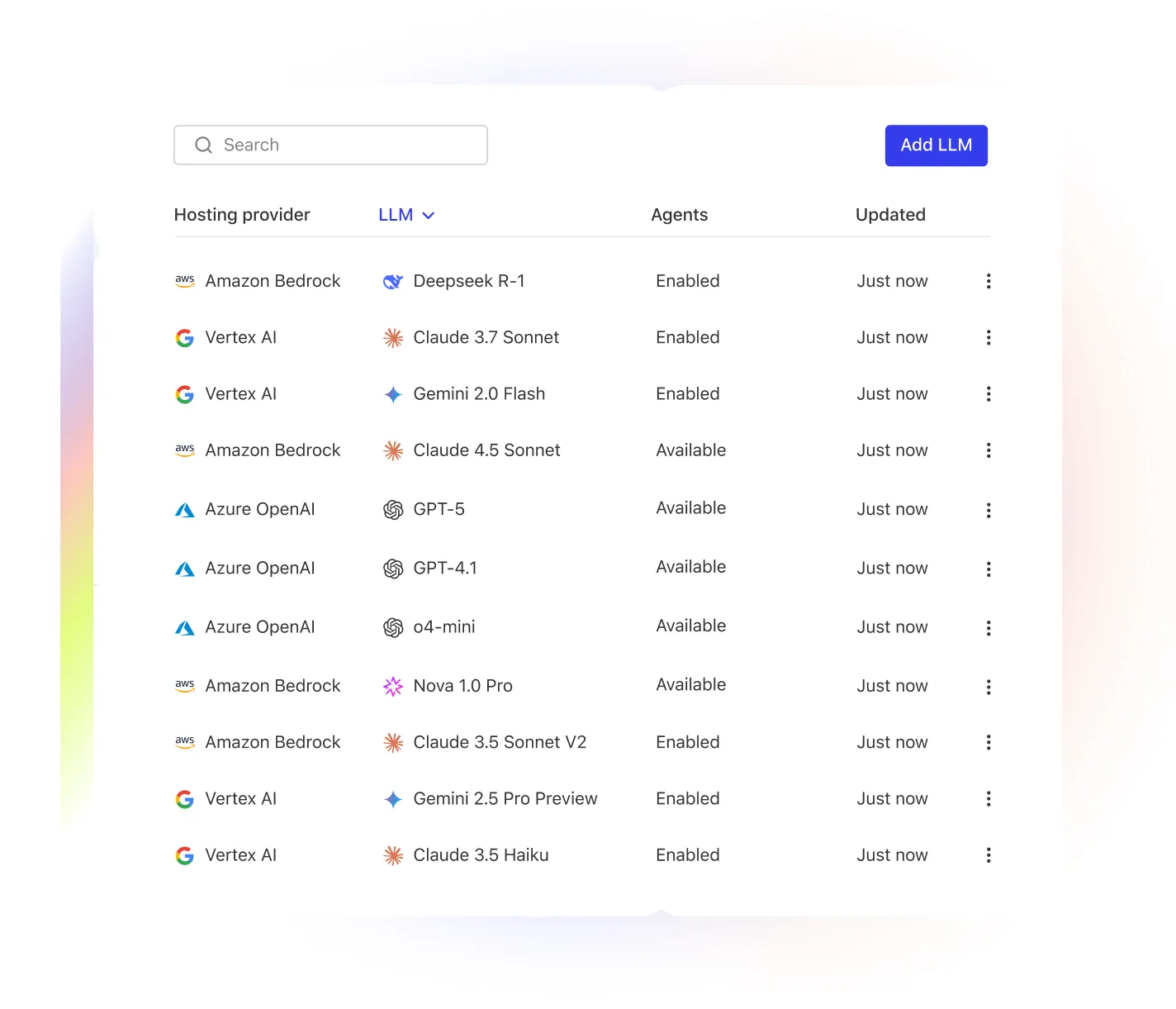 Quickly test the latest models, advancing the capabilities of your agents. Optimize agent performance by mixing and matching models.