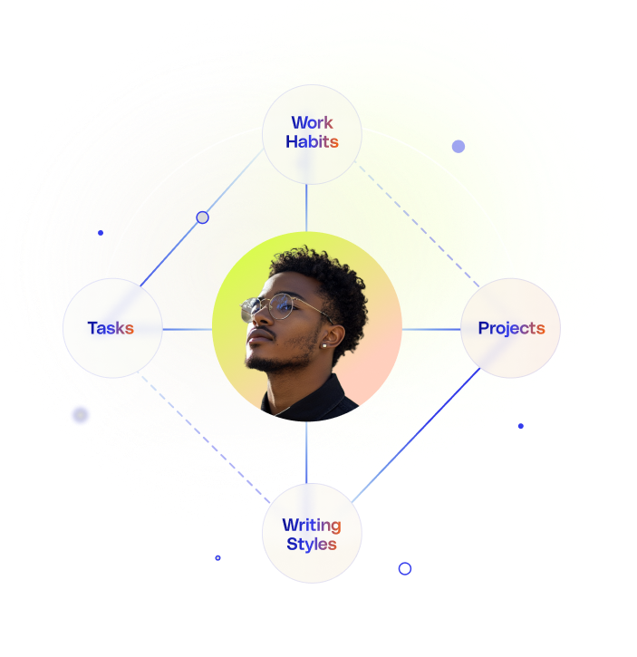 Work happens dynamically depending on the task at hand— especially the way we write. Glean’s personal graph categorizes your communication styles in up to 5 different profiles depending on content type and audience. The best profile is automatically fetched during any creative work, ensuring that the right rendition of your personal voice is included in any writing task.