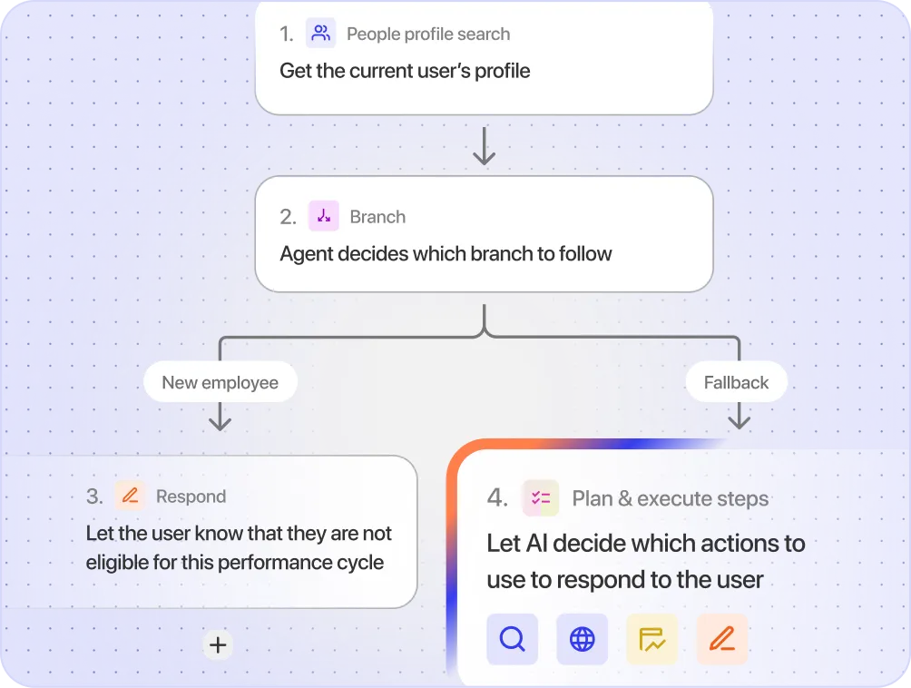 It’s the difference between forcing people through a script and letting them talk like humans. You explain the job. Glean builds the agent flexible, grounded in your data, and ready to run.